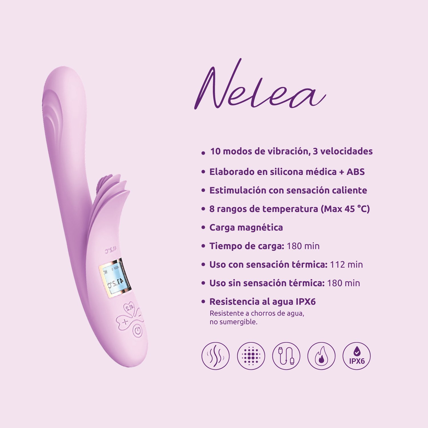 Con 10 modos de vibración, función de calefacción y pantalla LCD de control, el Nelea Rosado se adapta a tus deseos en cada momento. Además, es recargable por USB magnético y cuenta con hasta 180 minutos de uso continuo, para que nunca te quedes a medias.